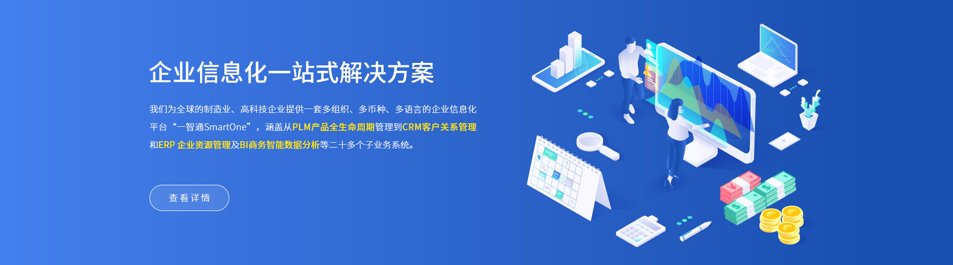 一智通(SmartOne)企業(yè)信息化一體化信息管理方案,涵蓋從 PLM 產(chǎn)品全生命周期管理 到CRM客戶關(guān)系管理和ERP企業(yè)資源管理及BI商務(wù)智能數(shù)據(jù)分析等二十多個(gè)子業(yè)務(wù)系統(tǒng)。