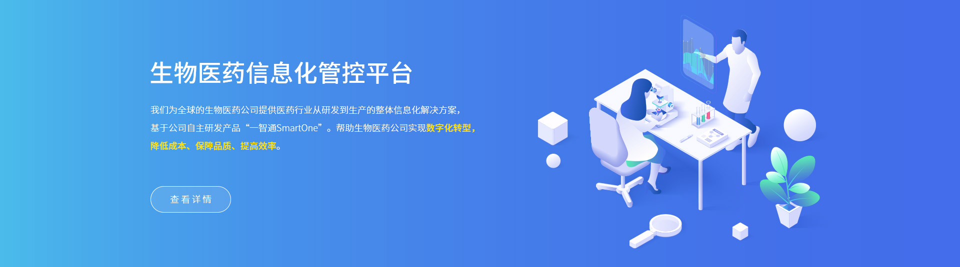 我們?yōu)槿虻纳镝t(yī)藥公司提供醫(yī)藥行業(yè)從研發(fā)到生產(chǎn)的整體信息化解決方案,基于公司自主研發(fā)產(chǎn)品“一智通SmartOne”。幫助生物醫(yī)藥公司實(shí)現(xiàn)數(shù)字化轉(zhuǎn)型,降低成本、保障品質(zhì)、提高效率。